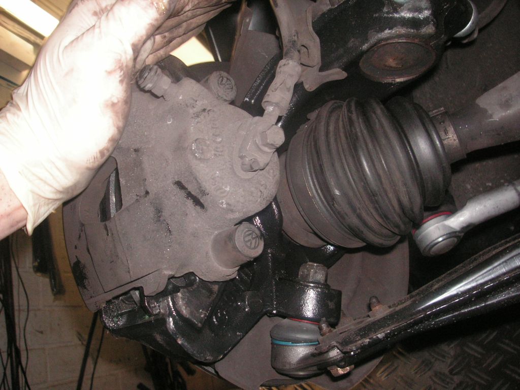 Während der Arbeiten an der Bremse darf der vom Bremssattelhalter abgeschraubte Bremssattel zu keiner Zeit lose am Bremsschlauch hängen, sondern der Bremssattel muss immer abgestützt werden!