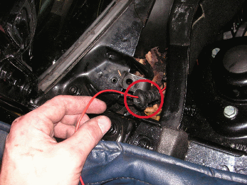 Nun muss man nur noch den Gummistopfen (rot) aus der Trennwand zum Innenraum herausziehen, ein kleines Loch durchstechen und das Kabel hindurchführen.
