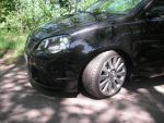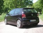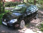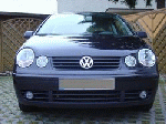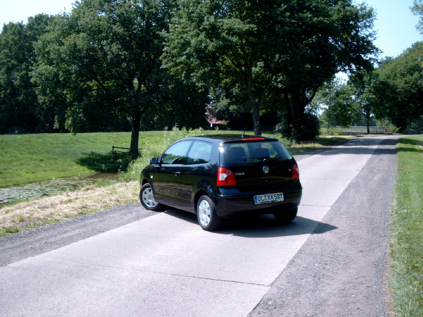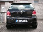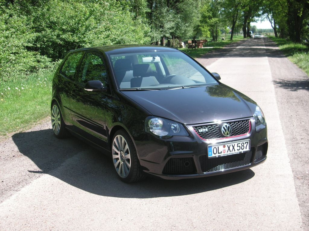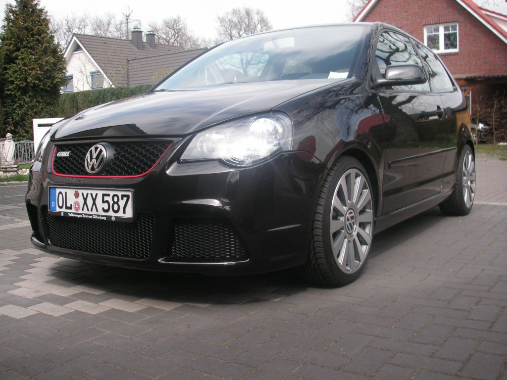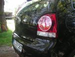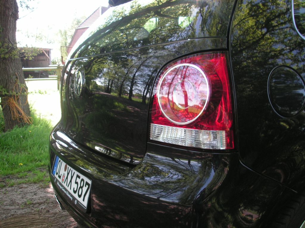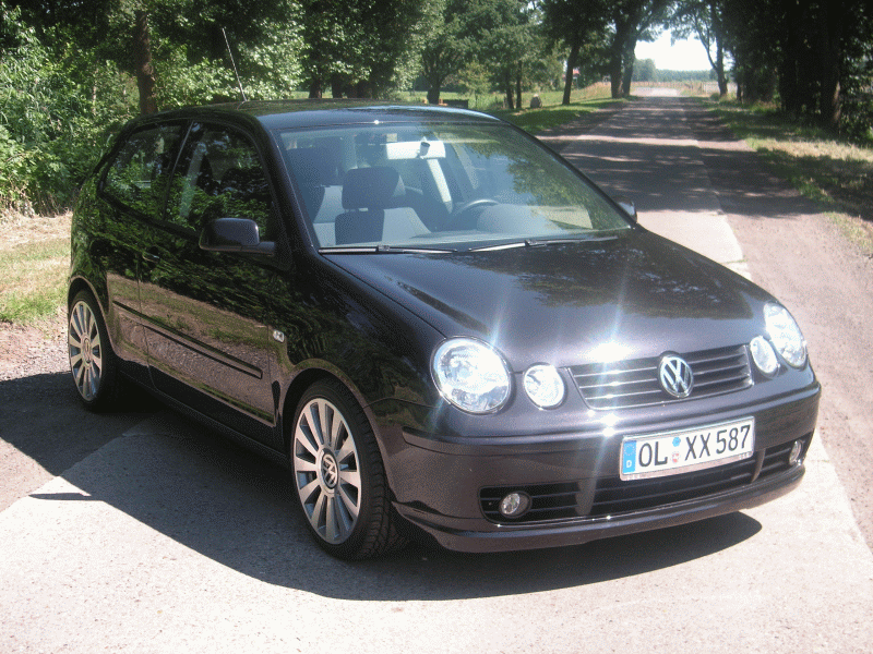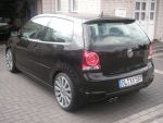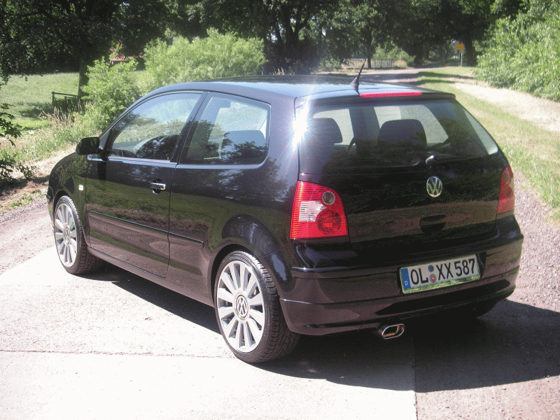 - Außenausstattung: Kompletter Außenumbau auf Polo 9N3 CUP-Edition, GTI-Endschalldämpfer, jeweils mit vier LED beleuchtete Türgriffe (gelb; 400mcd), Heckklappengriff entfernt und durch ein Heckklappenöffnendes Emblem aus dem VW Golf V ersetzt, Heckscheibenwischer entfernt, Echtglasstopfen in Heckscheibe, Diadem Blinkerbirnen rundum, lackierte Blinkerbirnenfassungen (silber), Türgriff Fahrerseite clean, Alu-Felgen (MAM 8 in 7,5x17" mit 205/40er Continental Rainsport Contact Bereifung rundum), Abschlepphakenabdeckung aus dem VW Golf 4, Außenspiegel mit Blinker und in schwarz lackierten Haltern + Umfeldbeleuchtung vom Skoda Octavia, GPS-Antenne vom Audi A4.