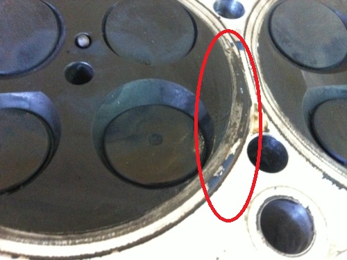 Die Zylinderkopfdichtung hat am 7. Zylinder zwischen Laufbuchse und Zylinderkopf nicht abgedichtet. Somit konnte dank der schwimmend gelagerten Laufbuchsen, das Abgas direkt in das Kühlsystem gedrückt werden was zu dem o.g. Problem geführt hat. |