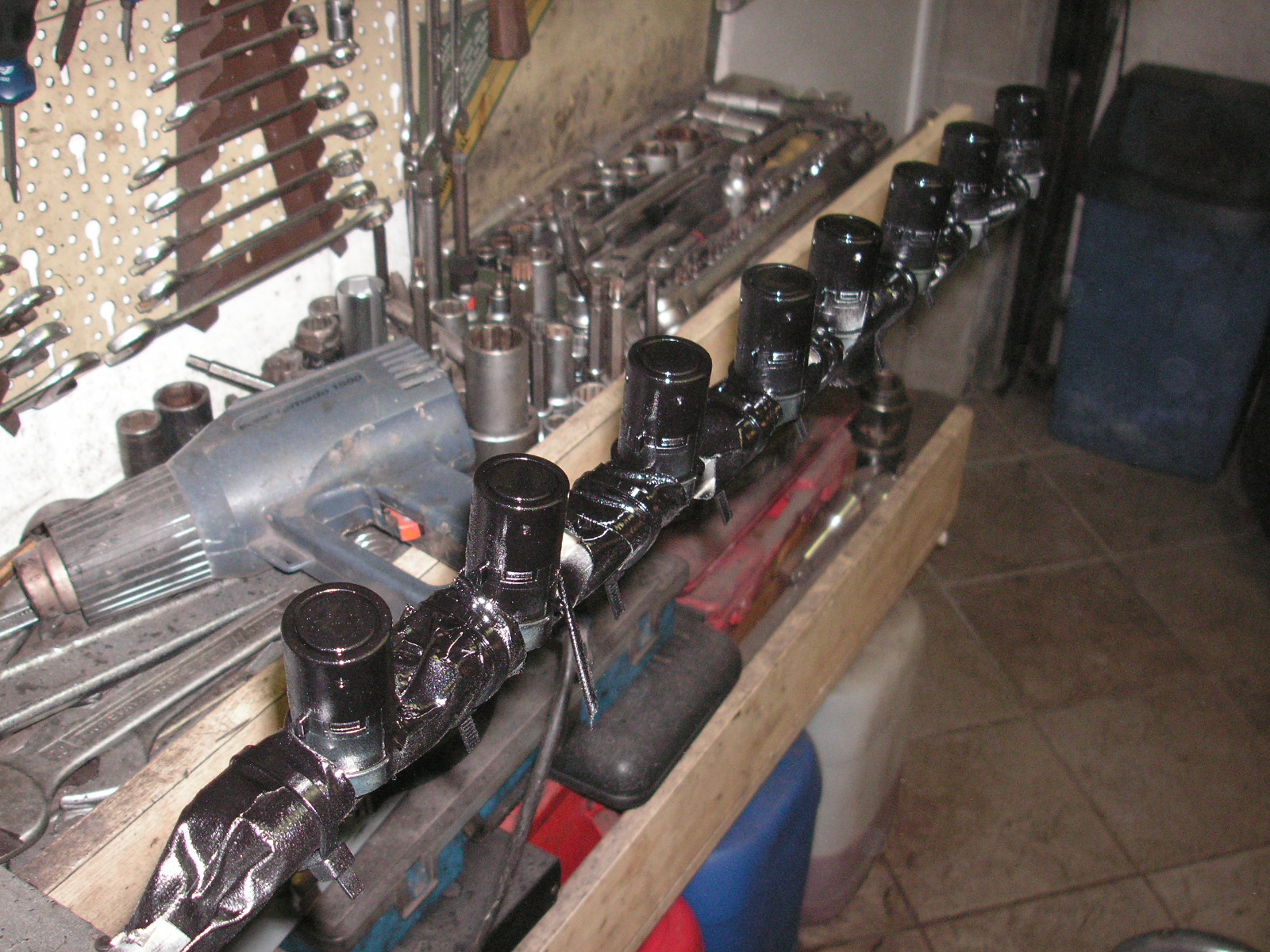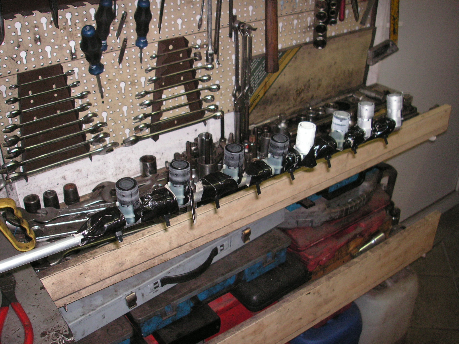 Bevor ich mit dem Bohren der Löcher in den Stoßfängern angefangen habe, habe ich zunächst die 8 PDC Sensoren in Wagenfarbe lackiert. |
