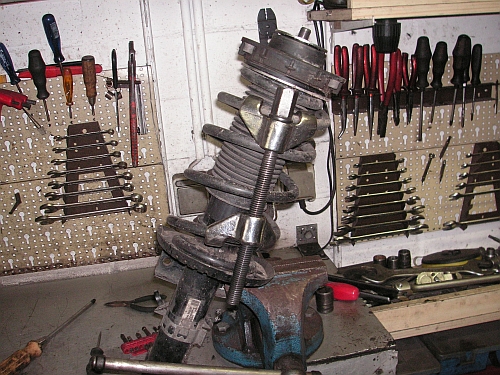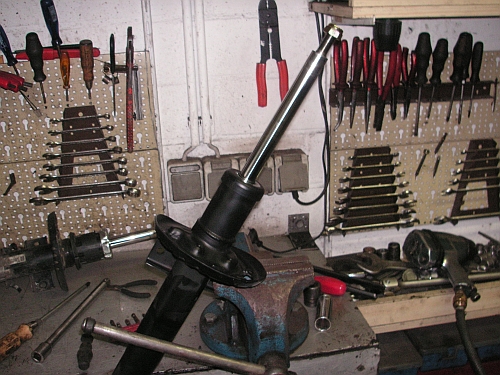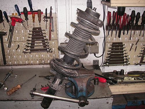 | Anschließend  müsst ihr eure Federspanner einsetzen, die Schraube oben am Dämpfer abschrauben (dabei drauf achten, das der Stoßdämpfer in sich nicht mitdreht!), das Domlager rausziehen und die Feder rausziehen.   |