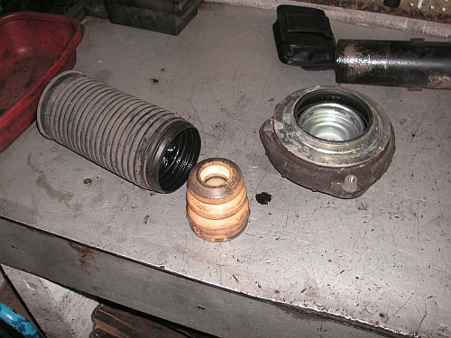 | Das sind die Teile des Stoßdämpfers. Man sollte schauen, ob der Puffer und die Staubmanschette unbeschädigt sind! Ansonsten müssen sie erneuert werden.  |