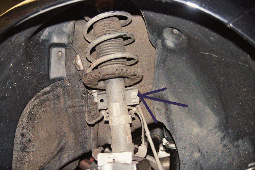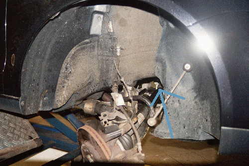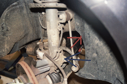 | Jetzt könnt ihr die große Schraube unten am Federbein abschrauben (blauer Pfeil) und die Leitungen einwenig freilegen, damit sie beim rausziehen des Federbeins nicht im Weg stehen.  Um das Federbein rausziehen zu können, muss man den Querlenker runterdrücken. Dieser lässt sich aber nicht weit genug runterdrücken, sodass man die Antriebswelle am Getriebe Abschrauben muss (roter Pfeil).  |